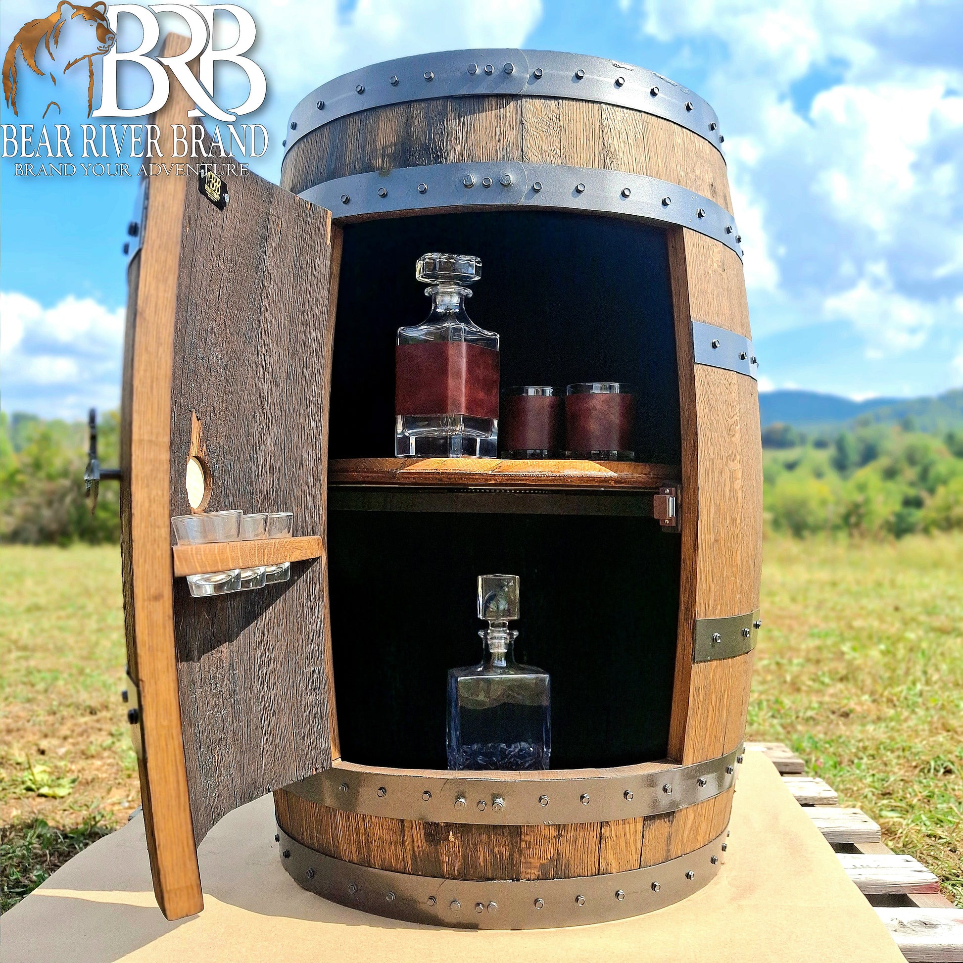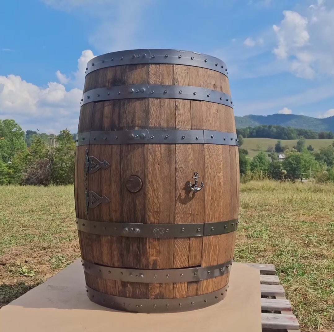 Sourced from various distilleries in Kentucky, Tennessee, North Carolina, and Virginia, each barrel is 100% authentic and may contain a faint whiskey/bourbon smell. Barrels measure roughly 21” x 36” and 26” in circumference and would have carried 53 gallons at their initial filling. Our barrel cabinets are sanded, stained, and the metal rings are secured. Each barrel has its own unique markings, are picked at random, and may or may not feature the original stamp or remnants of the stamp. No two are ever the same making each unique! Some of our barrels come from distilleries such as Knob Creek, Jim Beam, and many other large and small name distilleries. We cannot guarantee a specific distillery. No two barrels are ever the same!